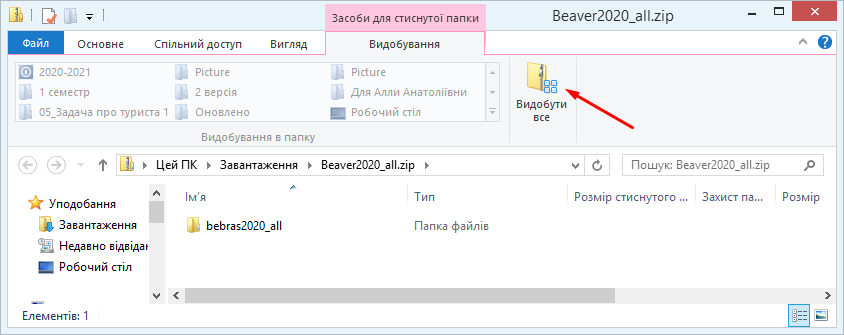 2 спосіб: двічі клацніть по скаченому файлі, у вікні Засоби для стиснутої папки натисніть