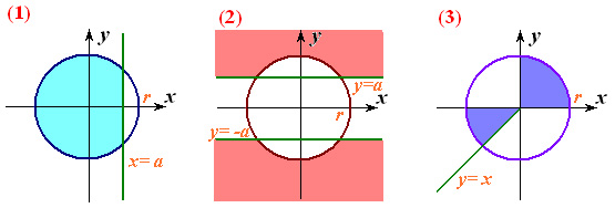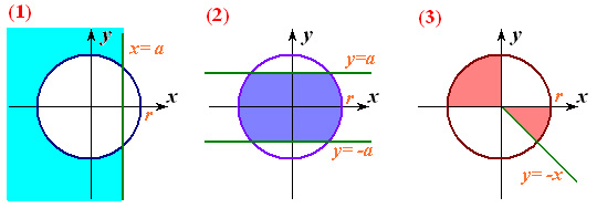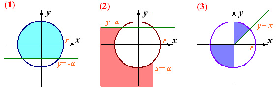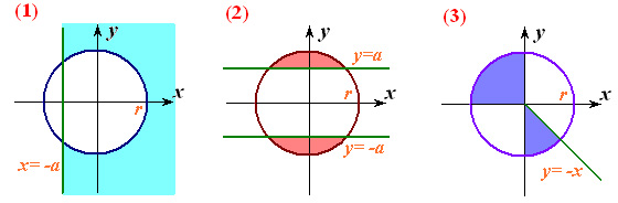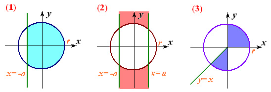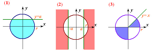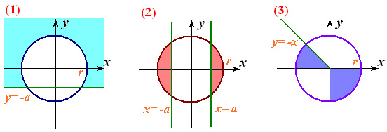 Файл “Oblasti3.dat” містить натуральне n (1, або 2, або 3), дійсні х, у, a (a>0) і r (r>0). Визначити, чи потрапляє точка (х, у) у заштриховану область із вказаним номером n. У файл “Oblasti3.sol” вивести true або false.